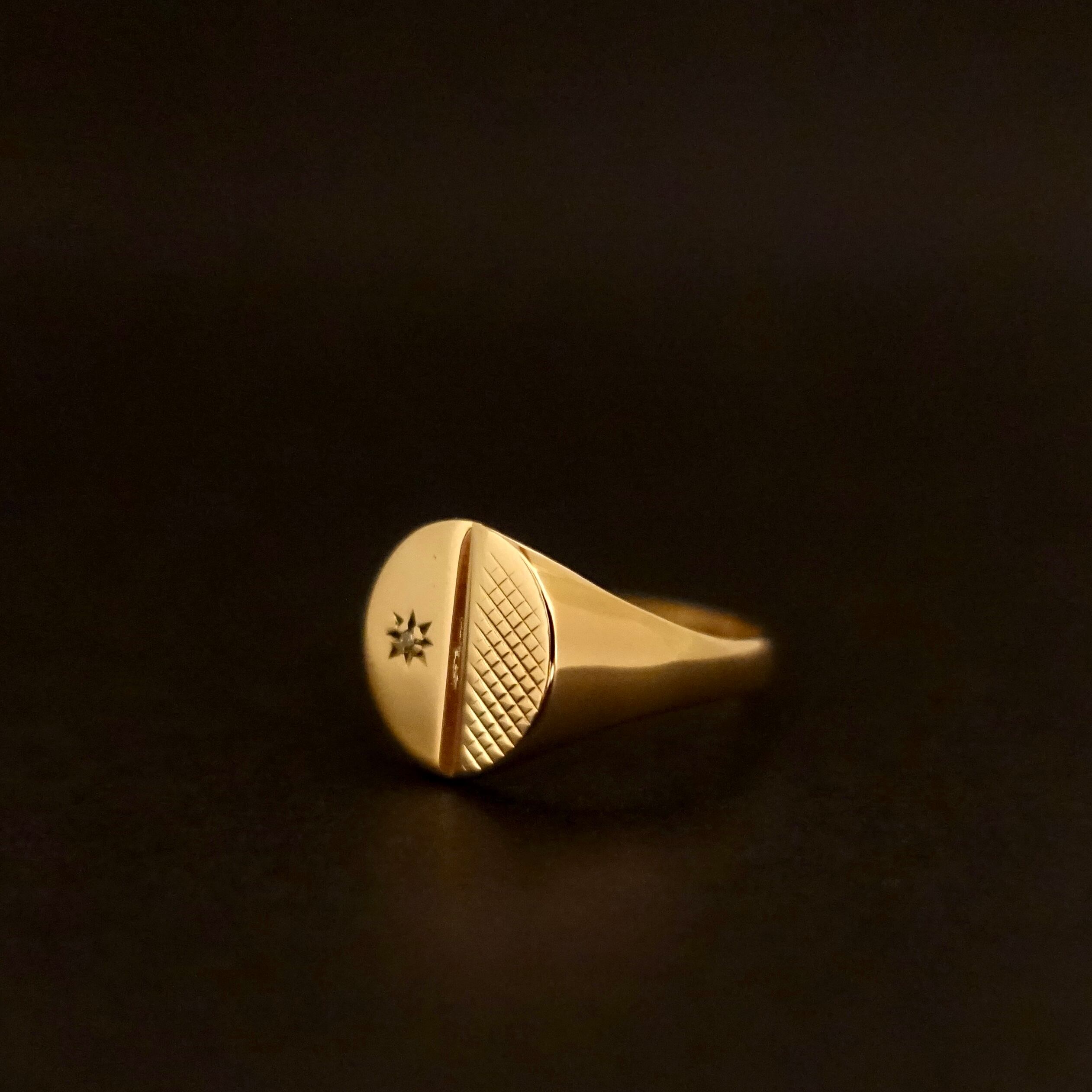 オーバルの印台に格子のカットとダイアモンドがセットされた珍しいシグネットリング。