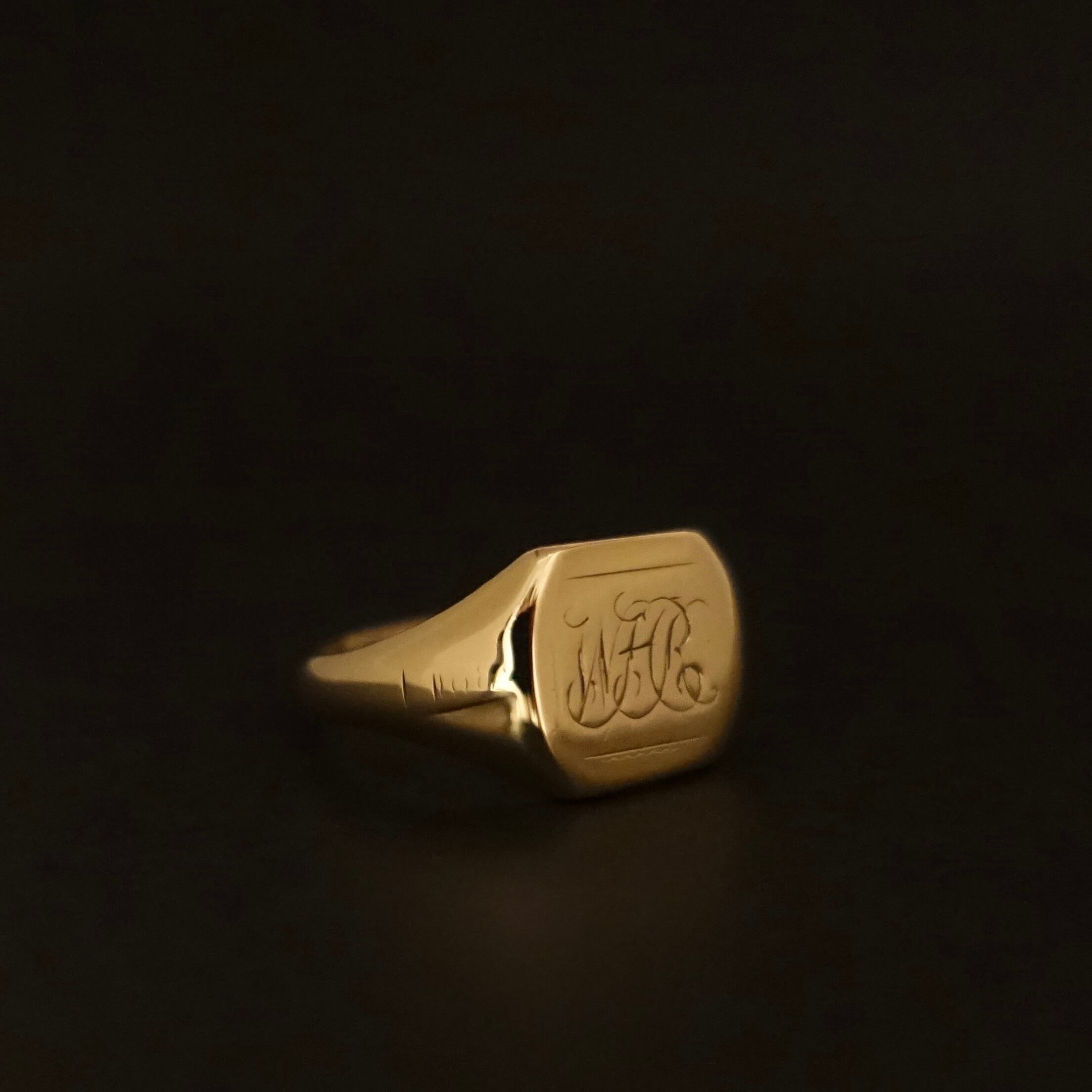 クラシックな書体のイニシャル(WHR)入りのシグネットリング。