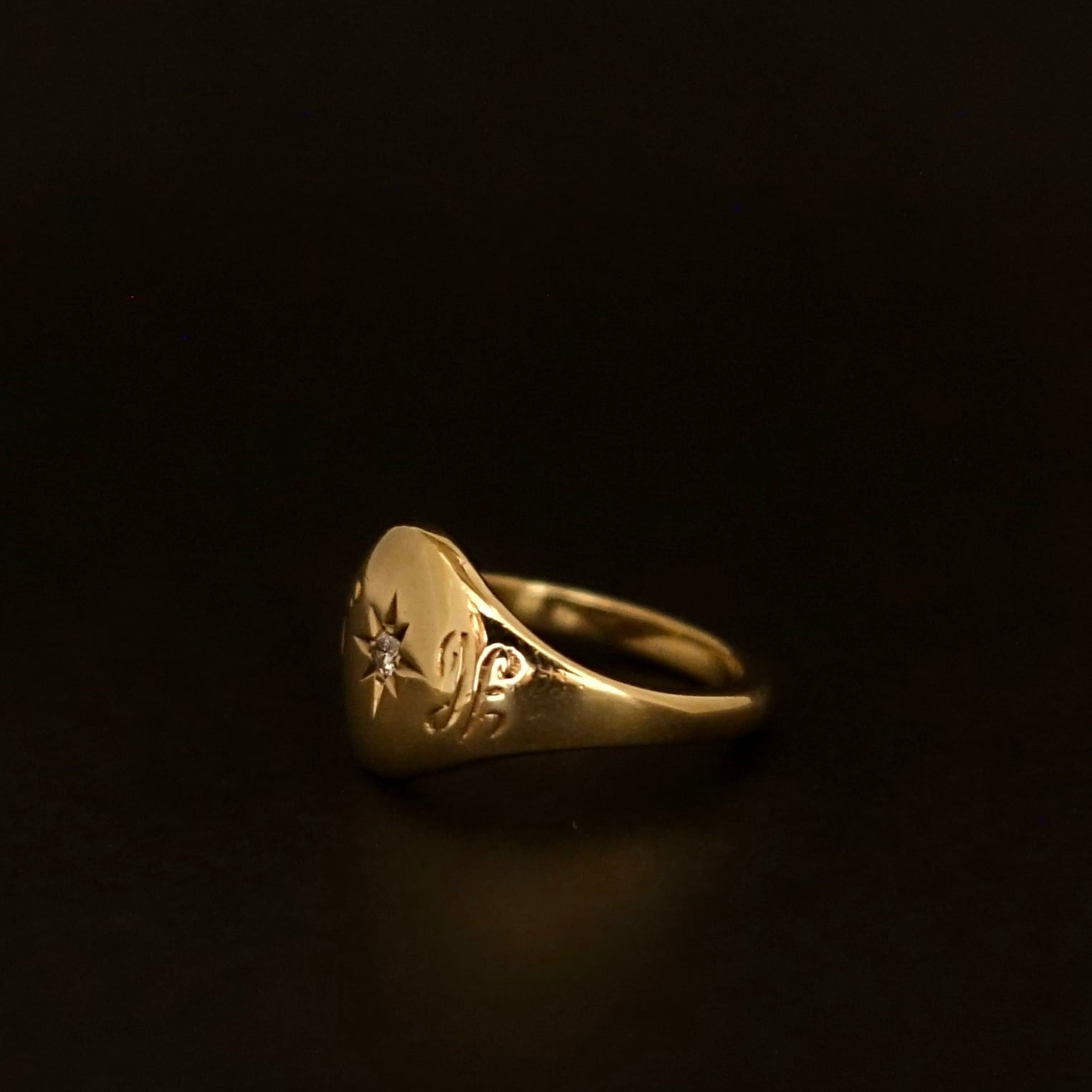 丸みのあるオーバルシェイプのトップにダイアモンドがセットされ、サイドにイニシャルが彫られた気品溢れるシグネットリング。