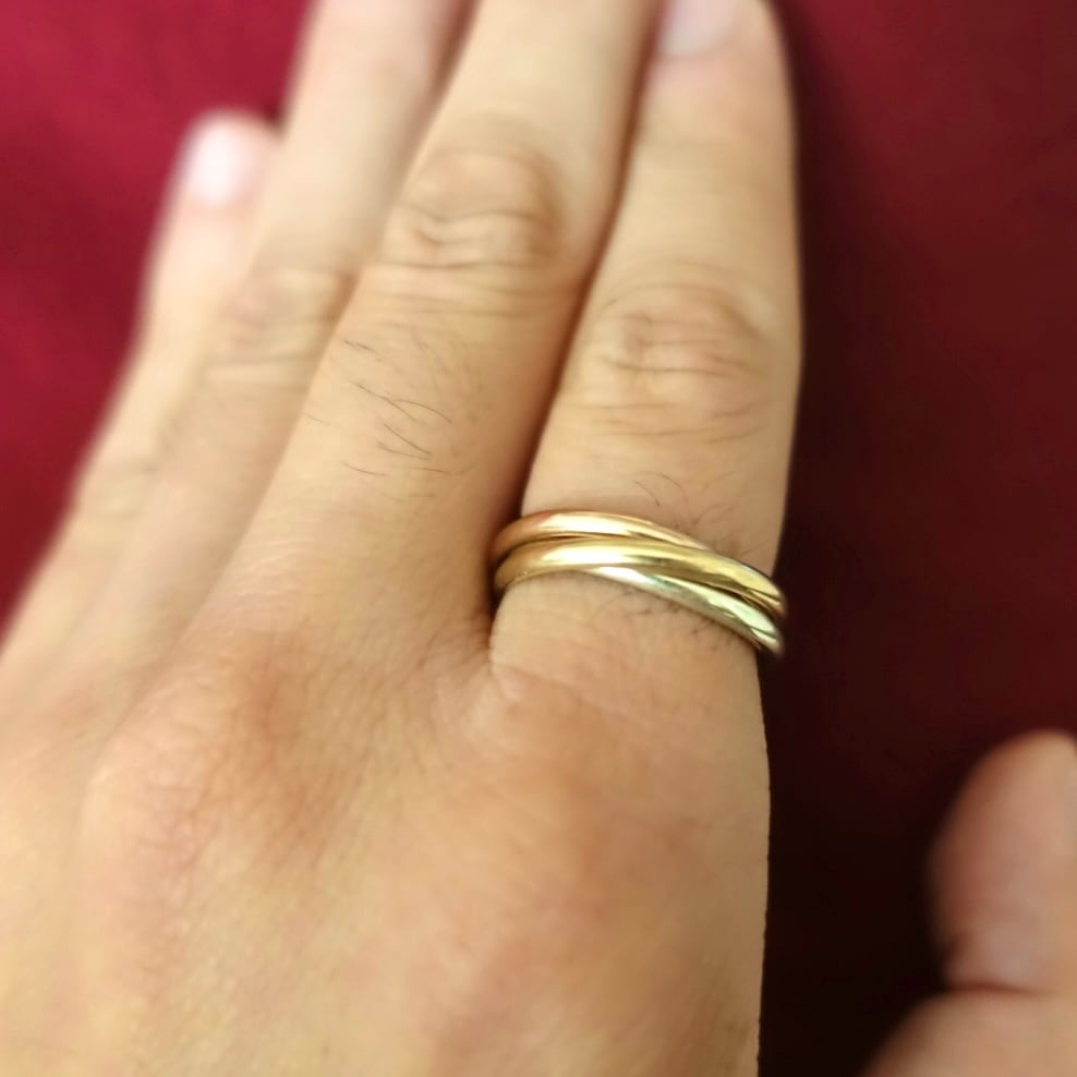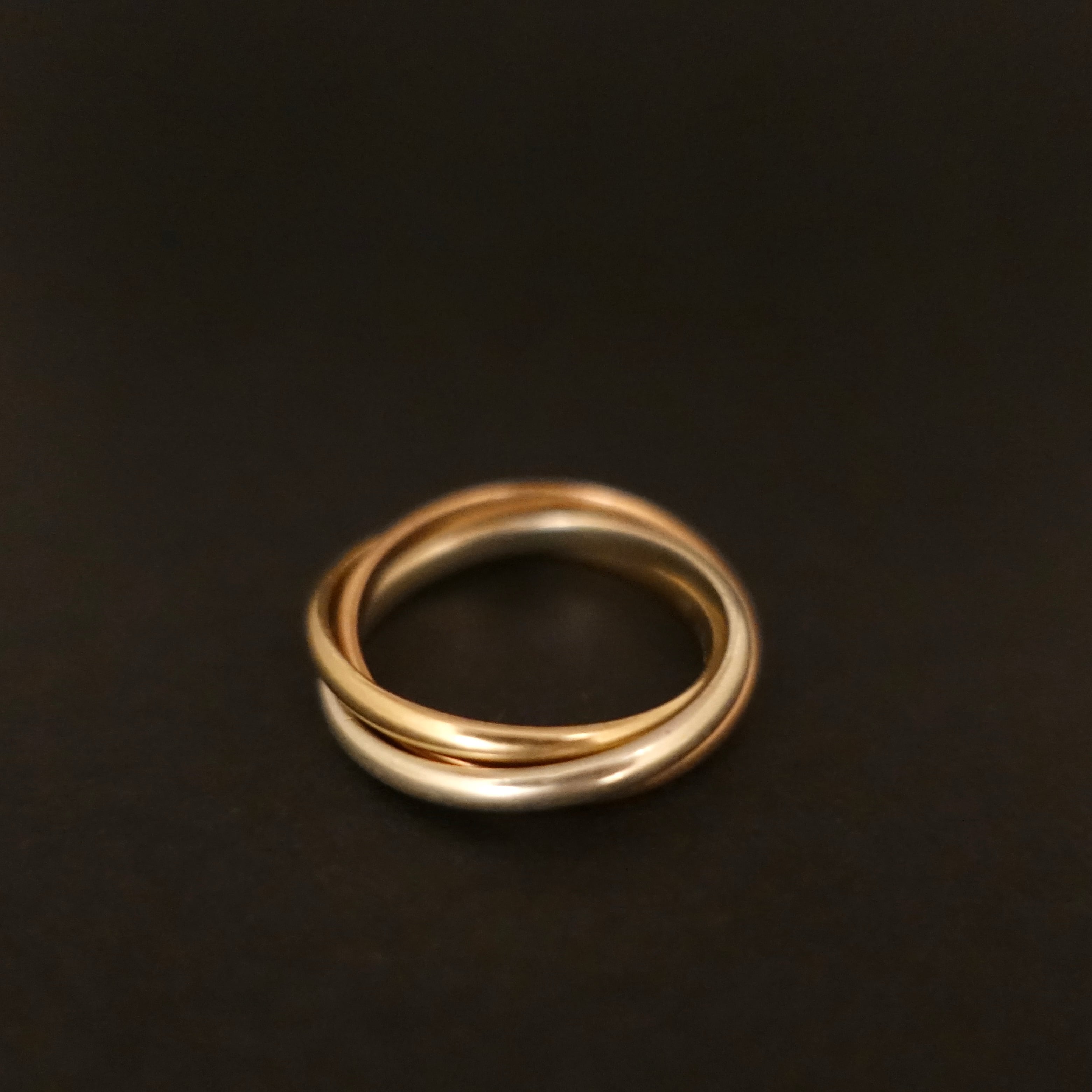 イエロー、ホワイト、ローズゴールドからなる3連リングです。