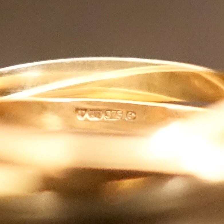 3色の落ち着きのある色合いの9ctゴールドの重なりが美しく、派手さを抑えたクラシックな雰囲気が醸し出された逸品。