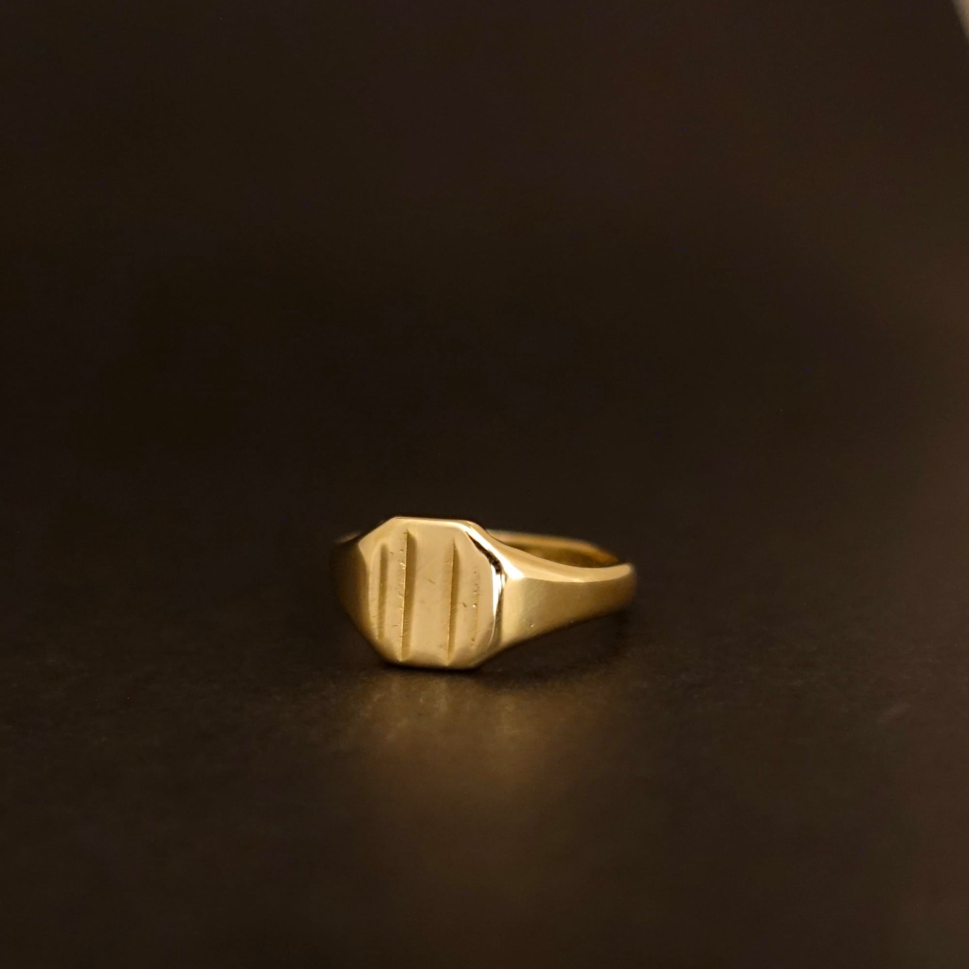 美しいヘキサゴンシェイプの印台に縦ラインの彫りが入ったシンプルかつクラシックなシグネットリング。